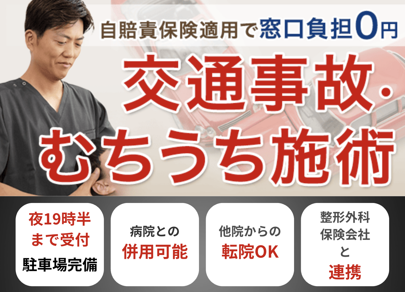 A:もちろんです。受傷部位が複数あっても並行して施術可能です。 事故の衝撃は全身に波及するため、首・腰・肩など複数箇所に痛みが出るのは珍しくありません。整形外科での診断名に基づき、すべての部位に対して適切なアプローチを行います。
