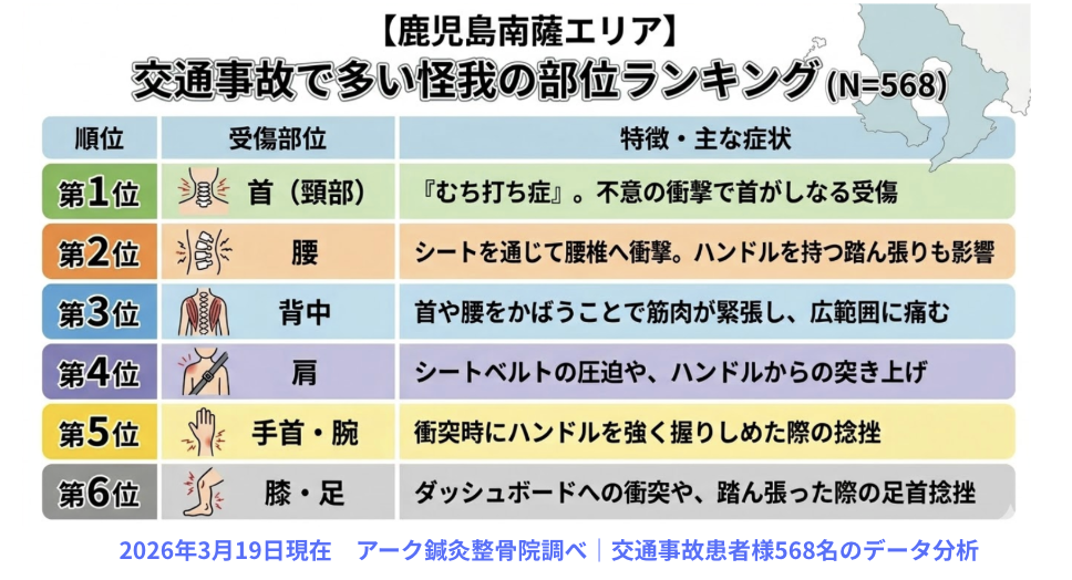 【鹿児島南薩エリア】交通事故で多い怪我の部位ランキング!アーク鍼灸整骨院|交通事故患者様568名のデータ分析