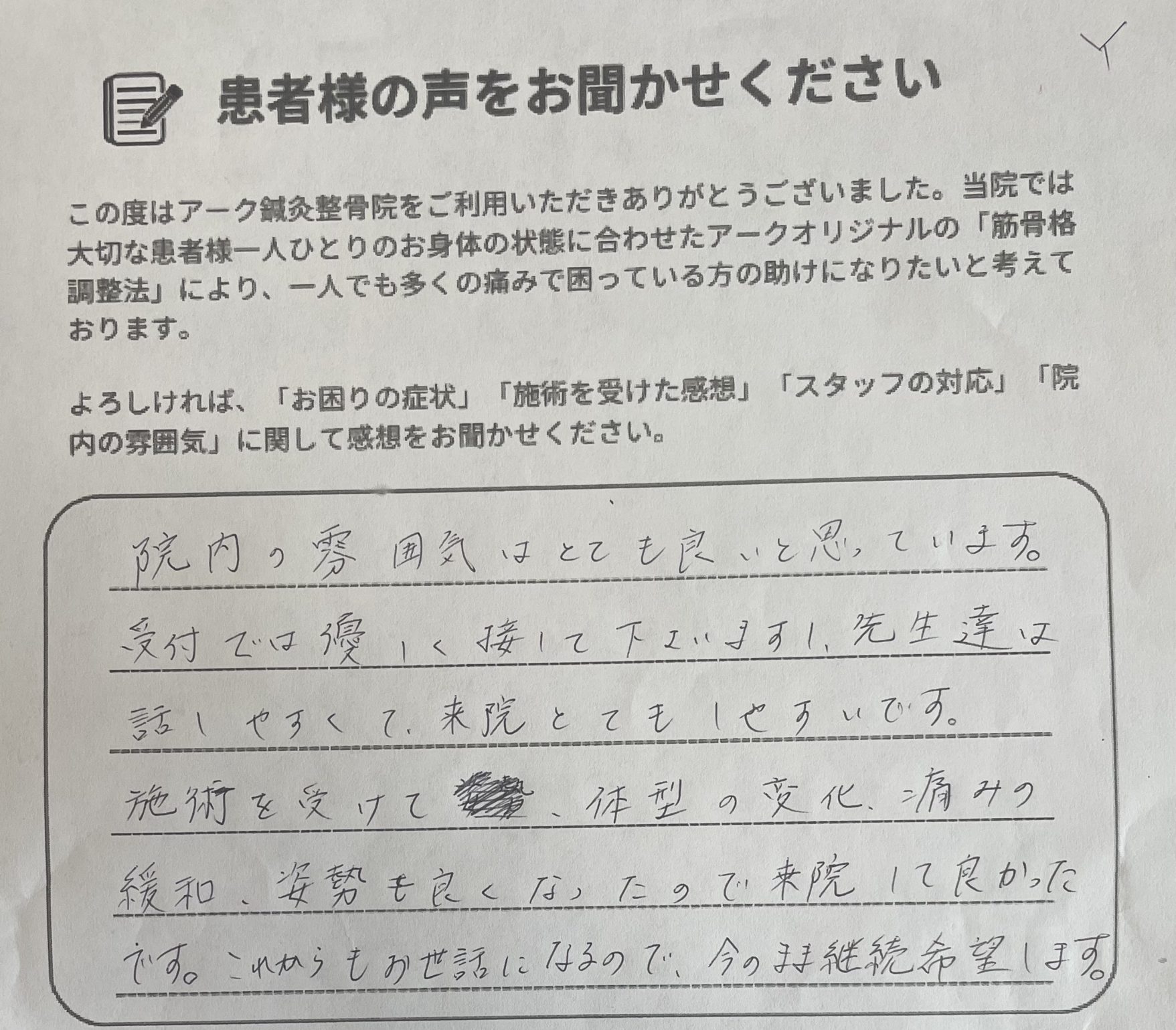 院内の雰囲気はとても良いと思っています。受付では優しく接してくださいますし、先生達は話しやすくて来院とてもしやすいです。施術を受けて体型の変化、痛みの緩和、姿勢も良くなったので来院してよかったです。これからもお世話になるので今のまま継続希望します。