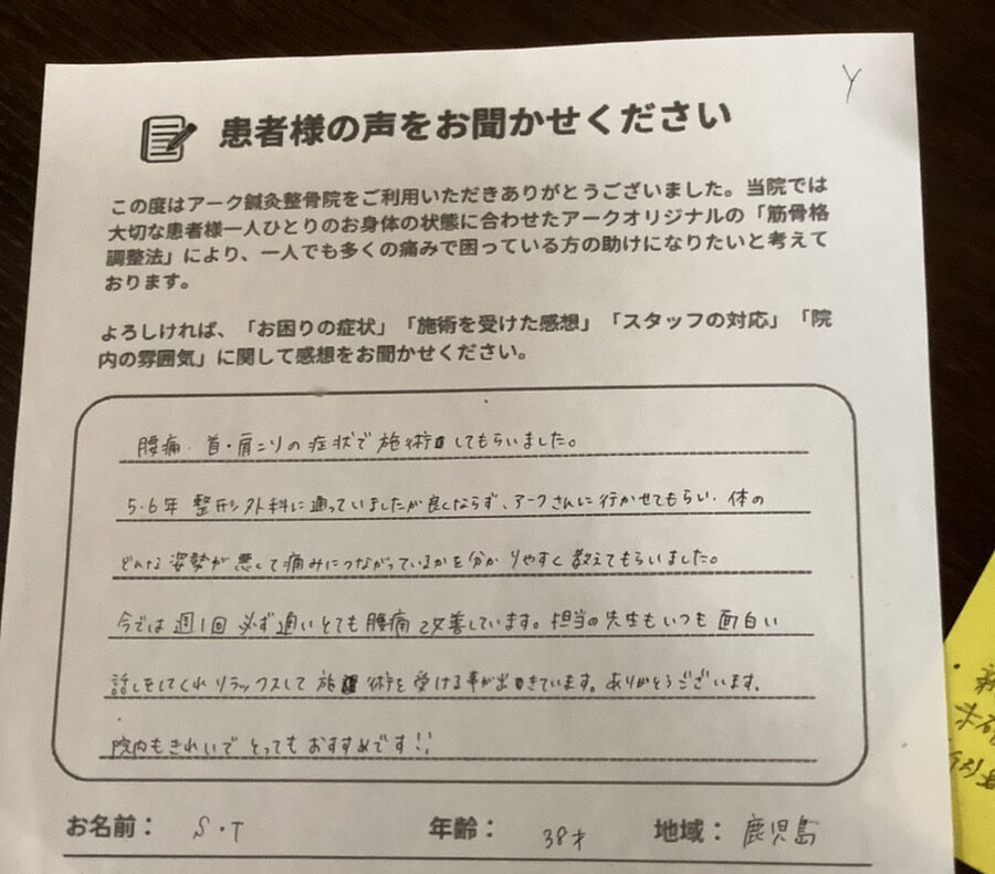 腰痛・首・肩こりの症状で施術してもらいました。 5・6年整形外科に通っていましたがよくならず、アークさんに行かせてもらい、体のどんな姿勢が悪くて痛みに繋がっているかをわかりやすく教えてもらいました。今では週1回必ず通い、とても腰痛改善しています。担当の先生もいつも面白い話をしてくれリラックスして施術を受けることができています。ありがとうございます。院内もきれいでとってもおすすめです!!