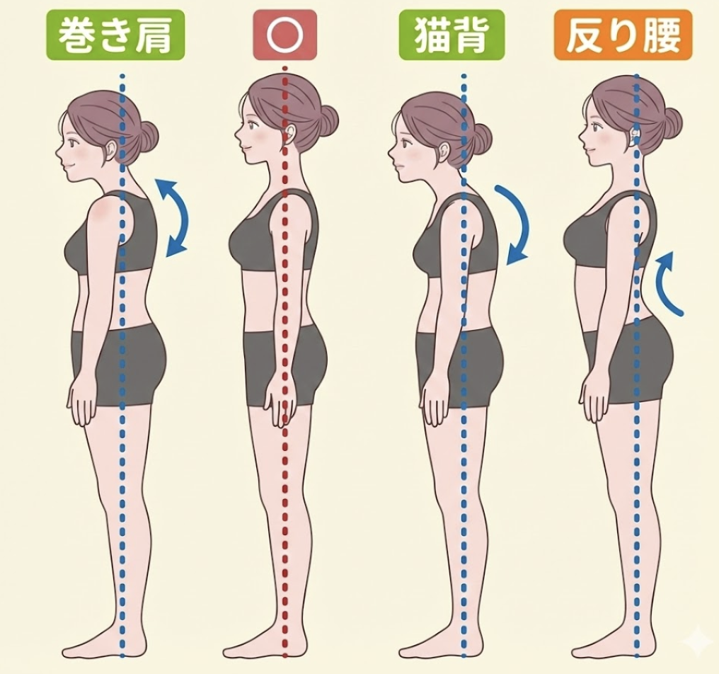 反り腰: 骨盤が過度に前傾し、腰椎に負担がかかっている状態。
