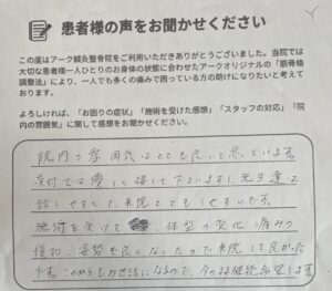 院内の雰囲気はとても良いと思っています。 受付では優しく接してくださいますし 先生たちは話しやすくて来院もしやすいです。 施術を受けて、体型の変化、痛みの緩和 姿勢も良くなったので 来院して良かったです。 これからもお世話になります。 今のまま継続希望します。