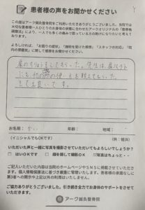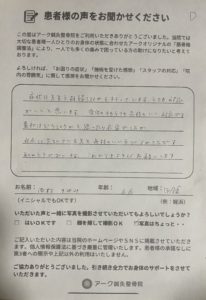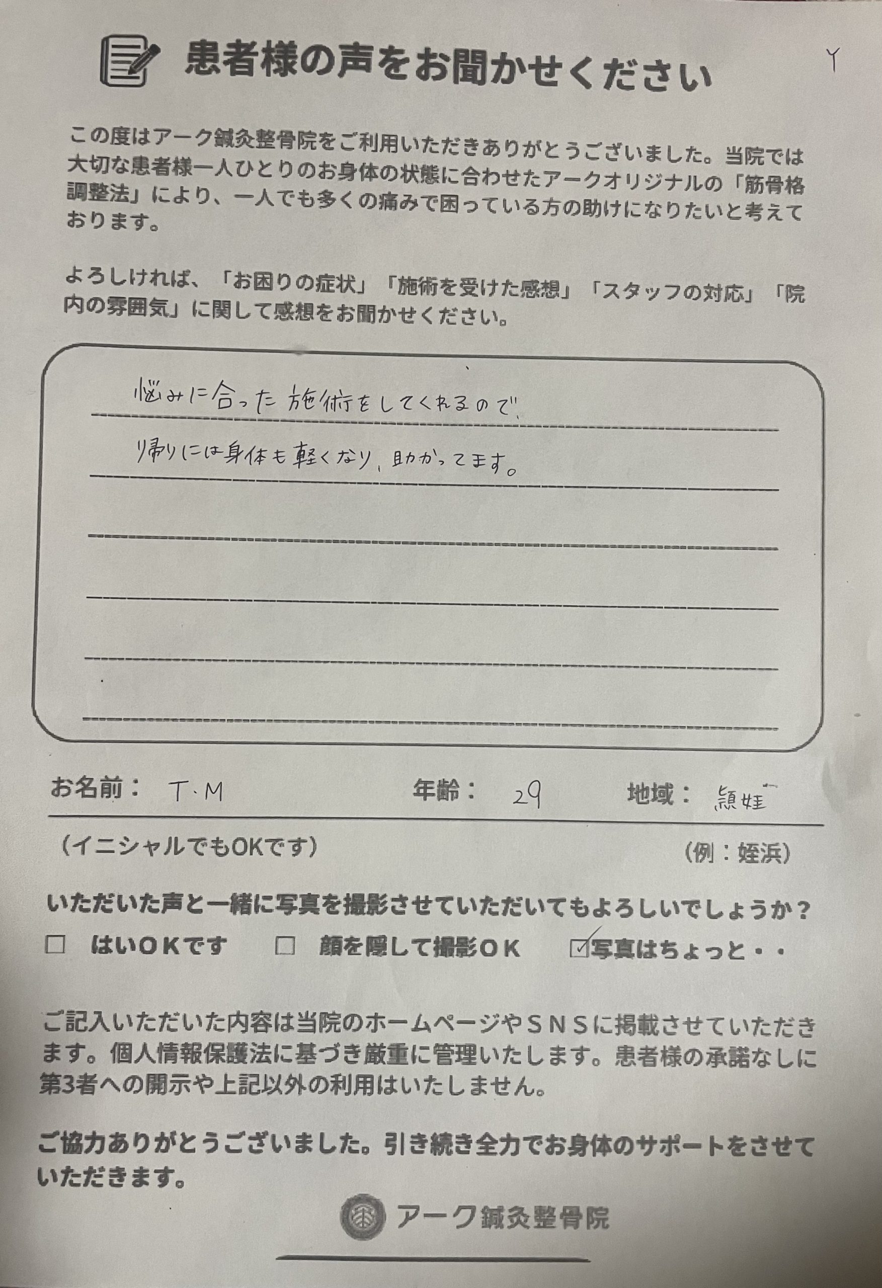 人の便りでアークを知り、行ってみようと思い 2〜3回と行くうちに、長年苦しんだ 右の肩が上がるようになり その内膝も良くなり 階段の上り下りも楽になり 半年以上通っています。 だいぶ楽になり今に至ります。