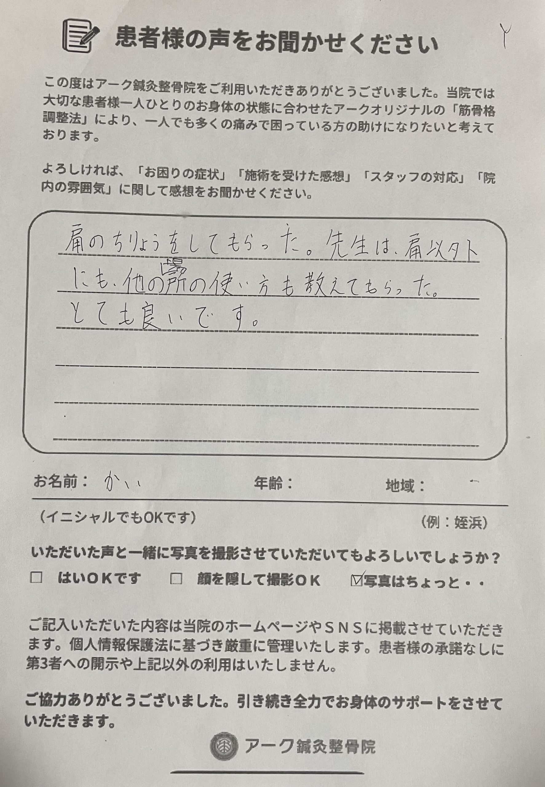 肩の治療をしてもらった。 先生は痛めないボールの投げ方を教えてくれた。 とても良いです。
