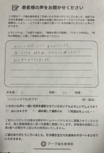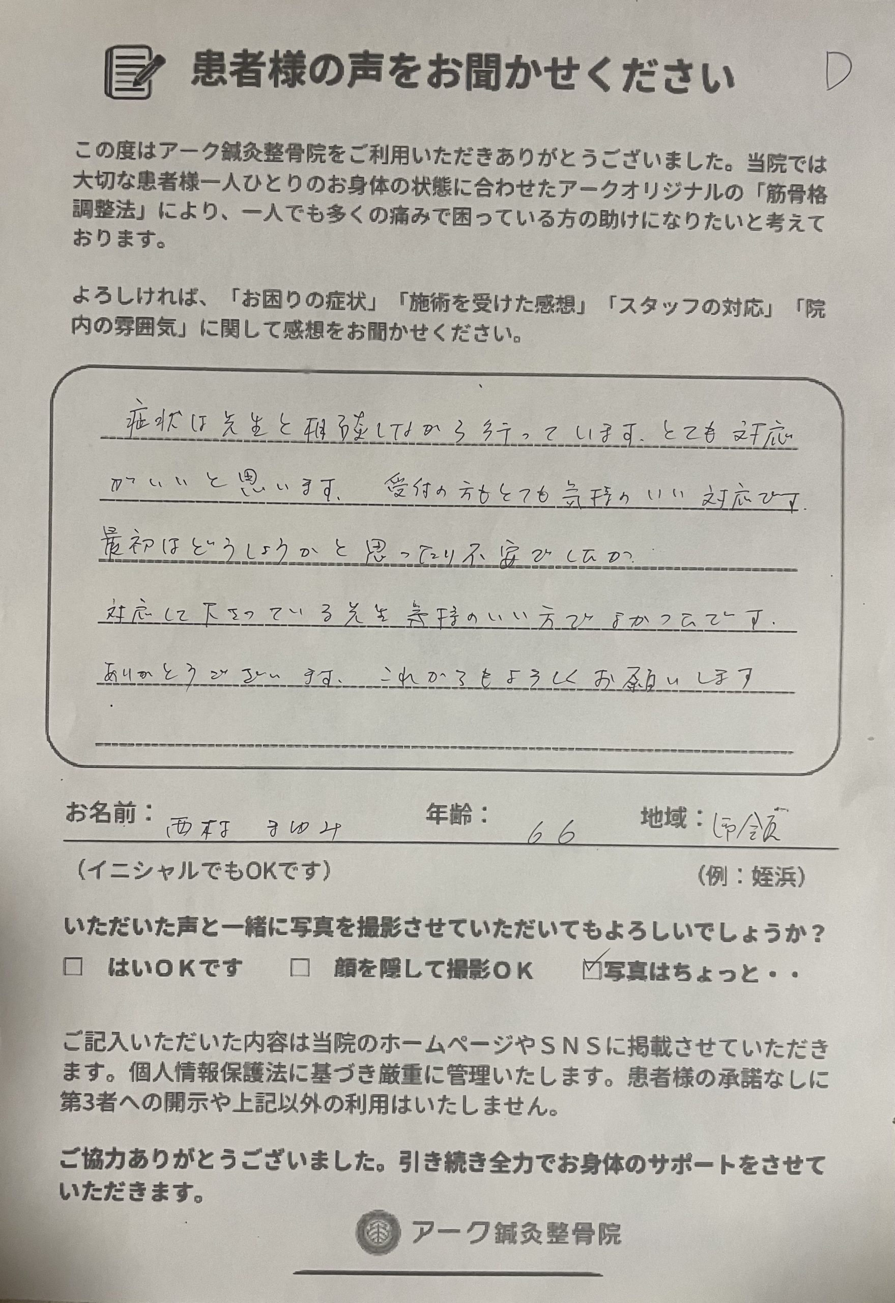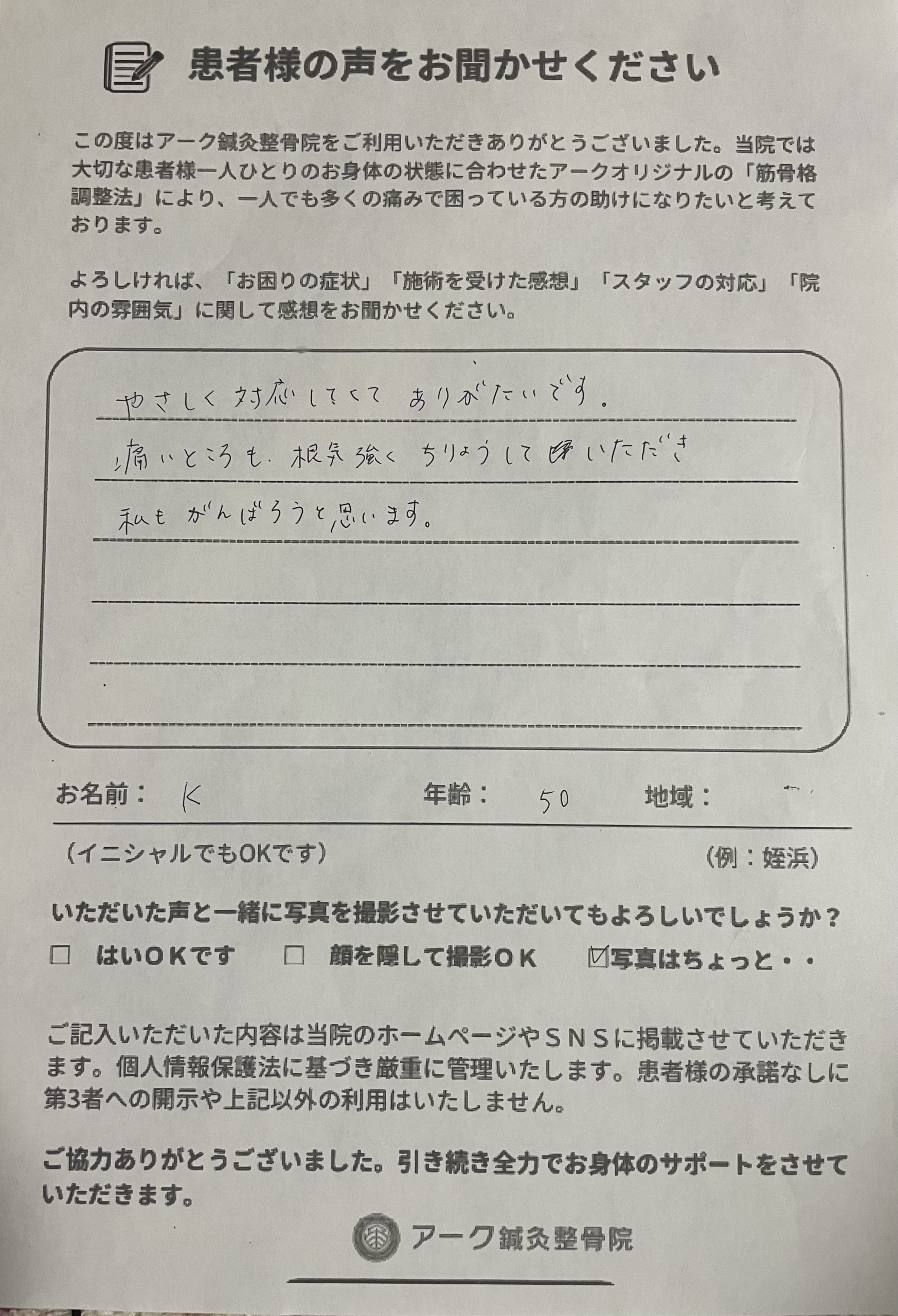 優しく対応してくれてありがたいです。 痛いところも根気強く治療して頂き 私も頑張ろうと思います。